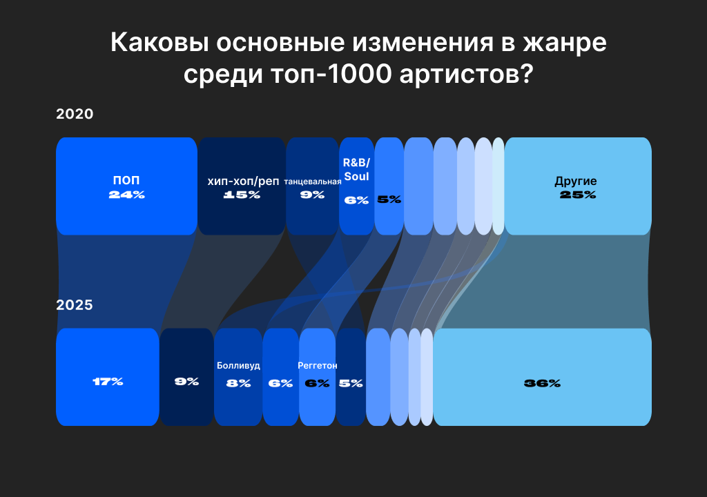 Среди 1000 самых популярных артистов всё меньше представителей традиционных жанров. Вместо них быстрее всего растут локальные направления — K-pop, болливуд, бразильский фанк и реггетон. С 2020 года именно они показывают самый сильный рост.