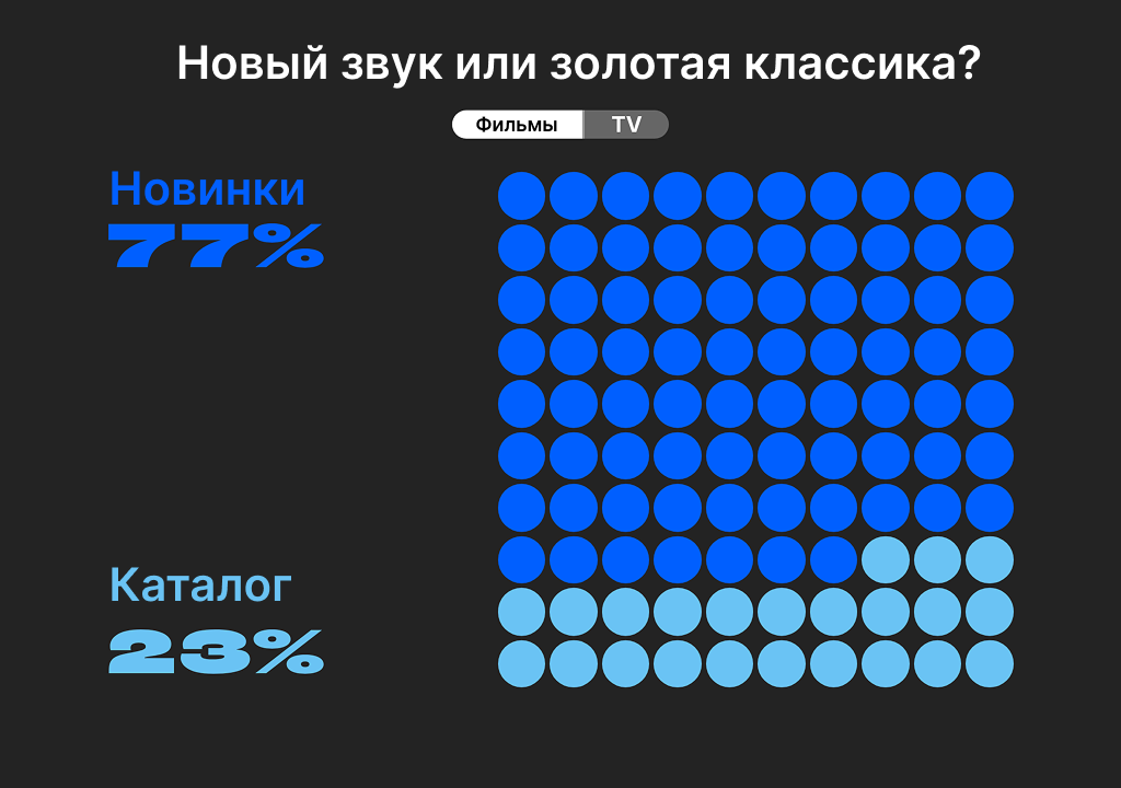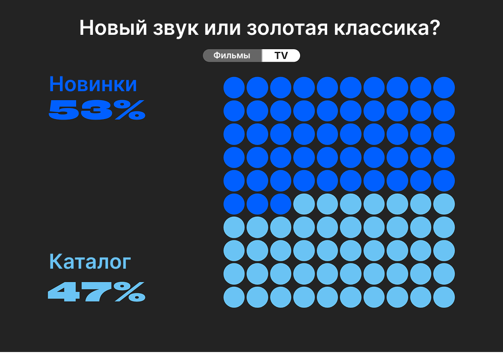 Интересно, что по телевидению чаще звучали старые треки — 53% синхронизаций пришлось на музыку из каталога. А в кино, наоборот, предпочитали новые — только 20% саундтреков были из прошлых лет.