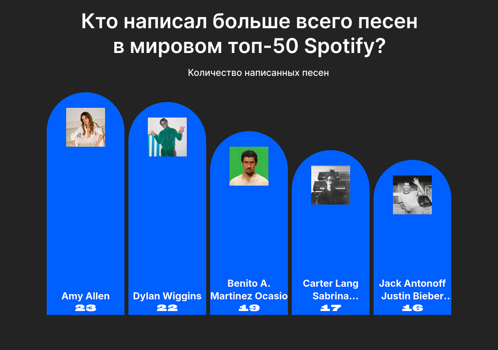 Большие команды авторов — уже норма, особенно у успешных артистов. Но при этом сами исполнители активно участвуют в написании своих треков. Половина из десяти самых плодовитых авторов 2025 года — это сами звёзды: Bad Bunny, Justin Bieber, Lady Gaga, Sabrina Carpenter и The Weeknd.