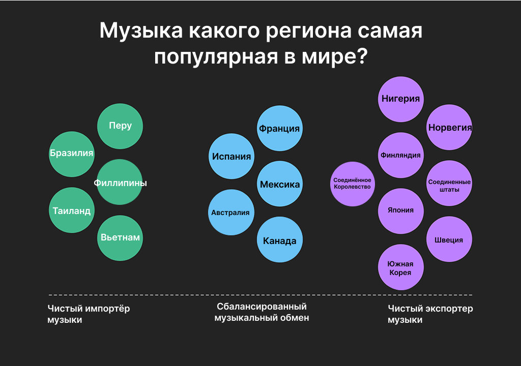 Лидерами по экспорту музыки в 2025 году стали Южная Корея и Норвегия. А главными «импортерами» международных хитов оказались города Юго-Восточной Азии и Латинской Америки. Это значит,что именно эти регионы теперь сильнее остальных влияют на то, какая музыка становится популярной по всему миру.
