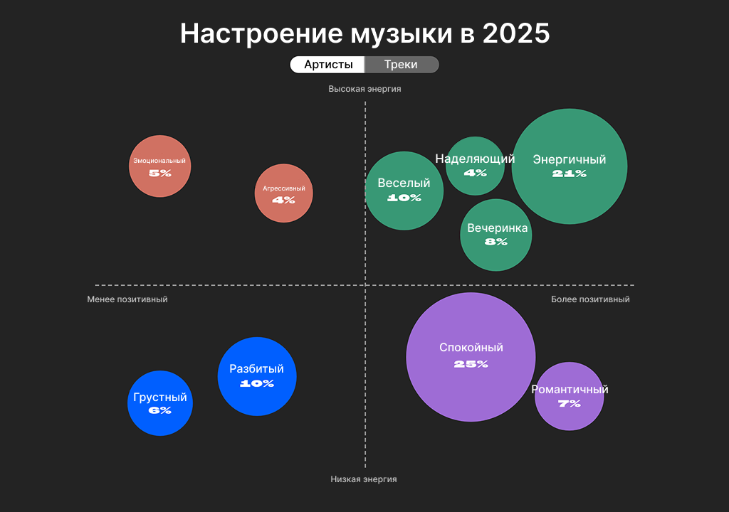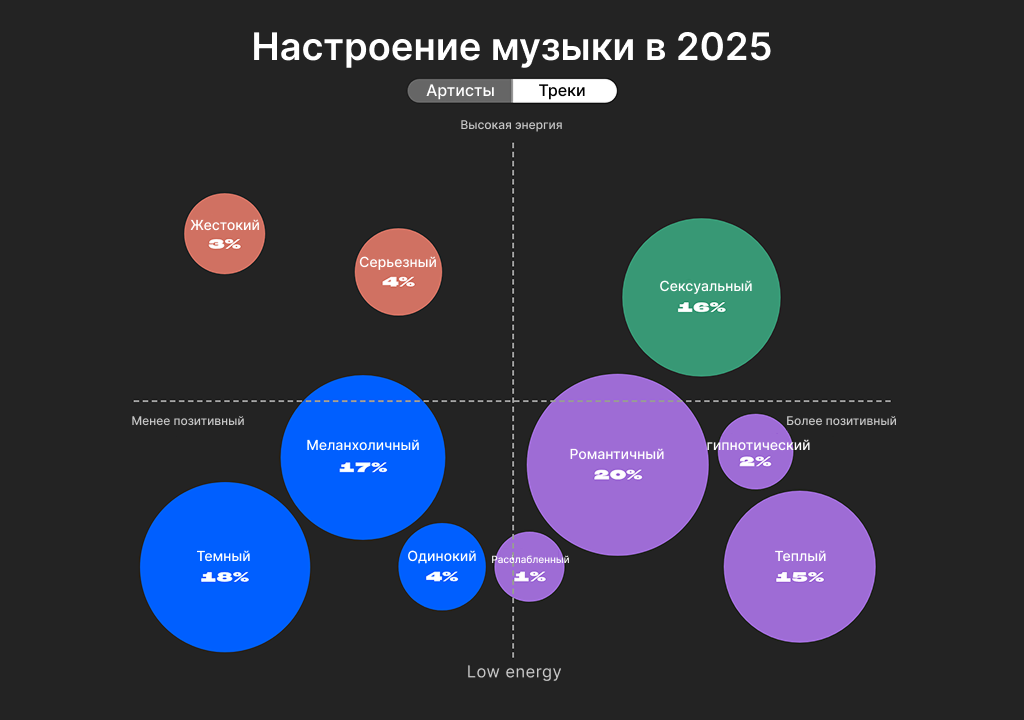 В 2025 году у артистов замечалось в тренде расслабленное настроение — «chill». Но когда речь идёт о конкретных треках, слушатели выбирают более эмоциональную музыку. На первом месте — романтические треки (20%), за ними — тёмные (dark) (18%) и грустные (blue) (17%) настроения. Из этого следует, что хотя имидж артиста может быть лёгким и позитивным, настоящие эмоции и глубина раскрываются именно в отдельных композициях.