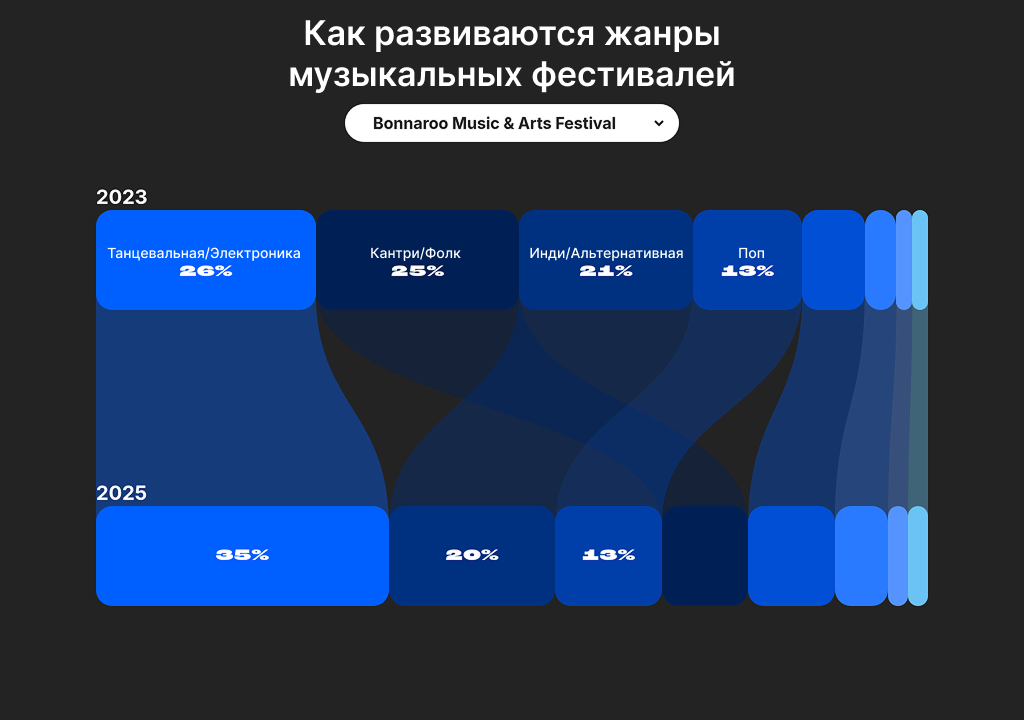 Лайнапы крупных фестивалей теперь формируются под вкусы аудитории, а не под общие тренды. С 2023 по 2025 год самый быстрый рост показал жанр dance/electronic: на Bonnaroo его доля выросла на 9%, на Lollapalooza — на 12%, а на Coachella он звучит почти в половине выступлений.