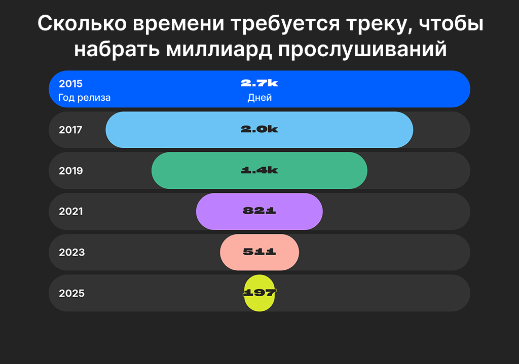Раньше отметка в миллиард прослушиваний ощущалась как настоящее событие, на достижение которого уходили годы. В 2015 году в среднем требовалось 2729 дней, чтобы трек набрал такое число стримов. К 2025 году этот срок сократился до 197 дней.